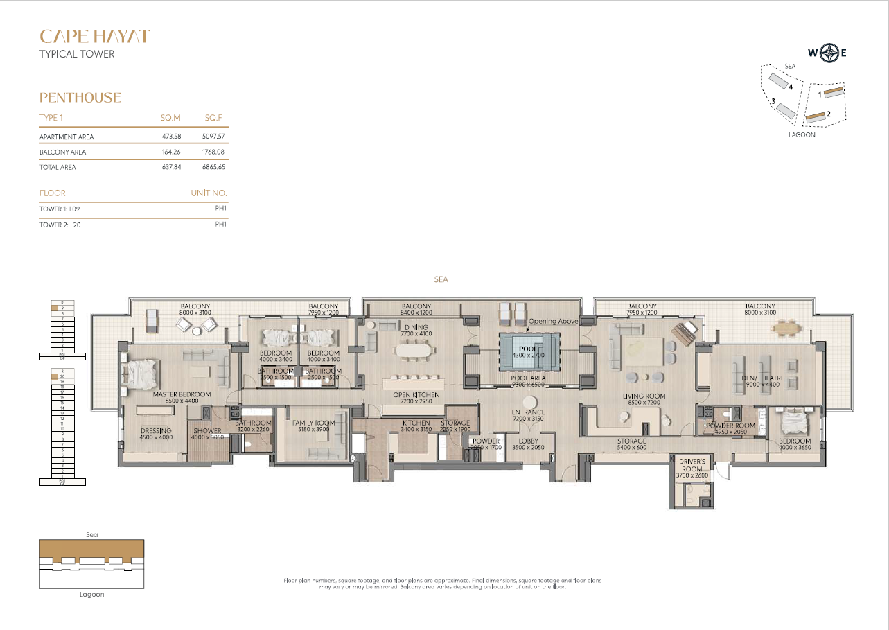 Dieses exklusive 4-Schlafzimmer-Penthouse krönt die obersten Etagen des Cape Hayat Towers und bietet ein Wohnerlebnis auf über 640 m² purer Eleganz. Bodentiefe Fenster und großzügige Balkone eröffnen spektakuläre Ausblicke auf das Meer, die Lagune und die umliegenden Mangrovenlandschaften.